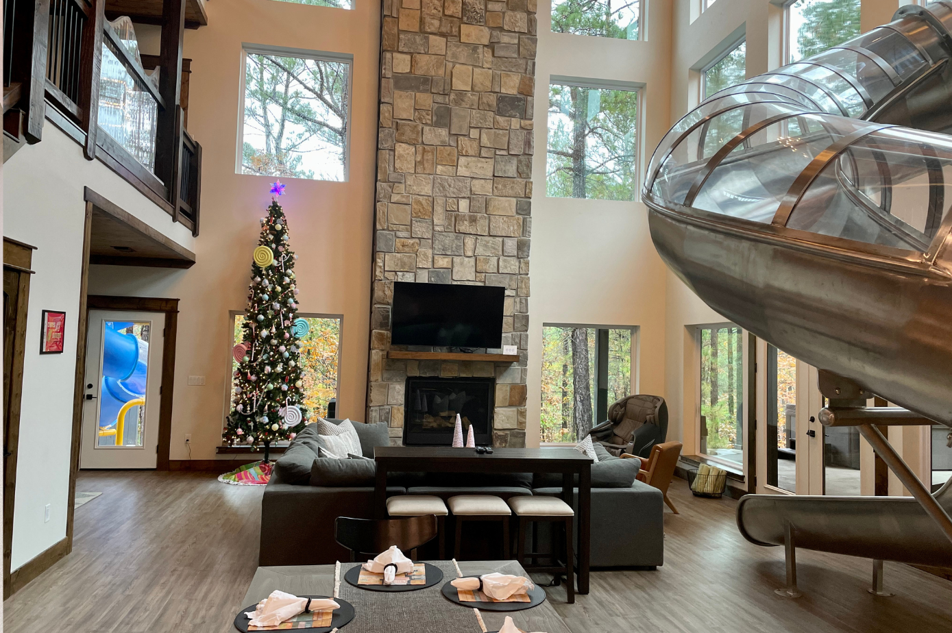 Prepare for non-stop fun and laughter in the Game Room, where excitement knows no bounds. Enjoy the Massage Chair, Arcade Game Table, a Pool Table, Poker Table, Bumper Pool Table, & Skee Ball. Embrace nostalgia with a classic Pinball Machine or showcase your vocabulary skills in an enthralling game of wall Scrabble. The littles will love the Mesh Disc Climber! The Cinema Theater Room is the perfect location to relax after a long day with Reclining Chairs or cuddle up on one of the comfy bean bag chairs to watch your favorite film. But that’s not all – brace yourself for an adrenaline-pumping experience with not just one but two slides! Zoom down the Three-Story Indoor Stainless See-Through Slide, feeling the rush of excitement in every twist and turn. Then, venture outside for the exhilarating Two-Story See-Through Slide, surrounded by the awe-inspiring beauty of nature. Outdoor games include Shuffle Board, Tether Ball, Horse Shoes, Ring & Hook Game, and a Triangular Tree Hammock which holds several kiddos. The heart of this enchanting realm is the chef’s delight Gourmet Fully Stocked Commercial Kitchen, adorned with mesmerizing granite countertops. Equipped with three washer and dryers, two dishwashers and a large 48″ professional range, creating culinary masterpieces becomes a joyous affair. And for those who relish the outdoors, check out the pass-through window to the outdoor kitchen with gas powered built-in outdoor grill and flat-top griddle that beckon you to explore the art of alfresco dining. The large expansive decks adorned with plentiful outdoor seating, outdoor fireplace, firepit, disc swings and a bench swing are the perfect location to soak in the surrounding beauty. Stare out into the grounds at night to see solar powered firefly lights, lining the old logger road leading up to the cabin. To complete the indulgence, not one, but two hot tubs await. Soothe your senses and unwind in the bubbling water – one located on the bottom deck for a cozy experience and another on the third-story deck, offering panoramic views of the towering pines and Ouachita Mountains. Use the view finder scope to uncover mysteries many miles away from the rooftop patio.  This home is equipped with a EV Level 2 plug. Please bring your own charging cable to plug into our EV outlet.