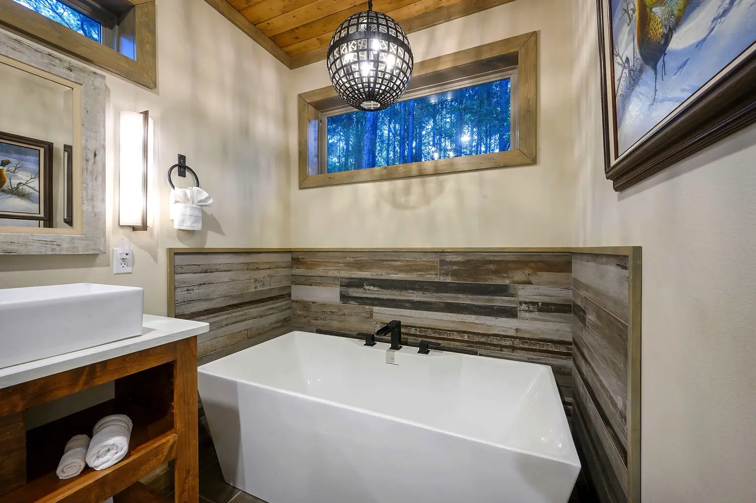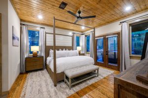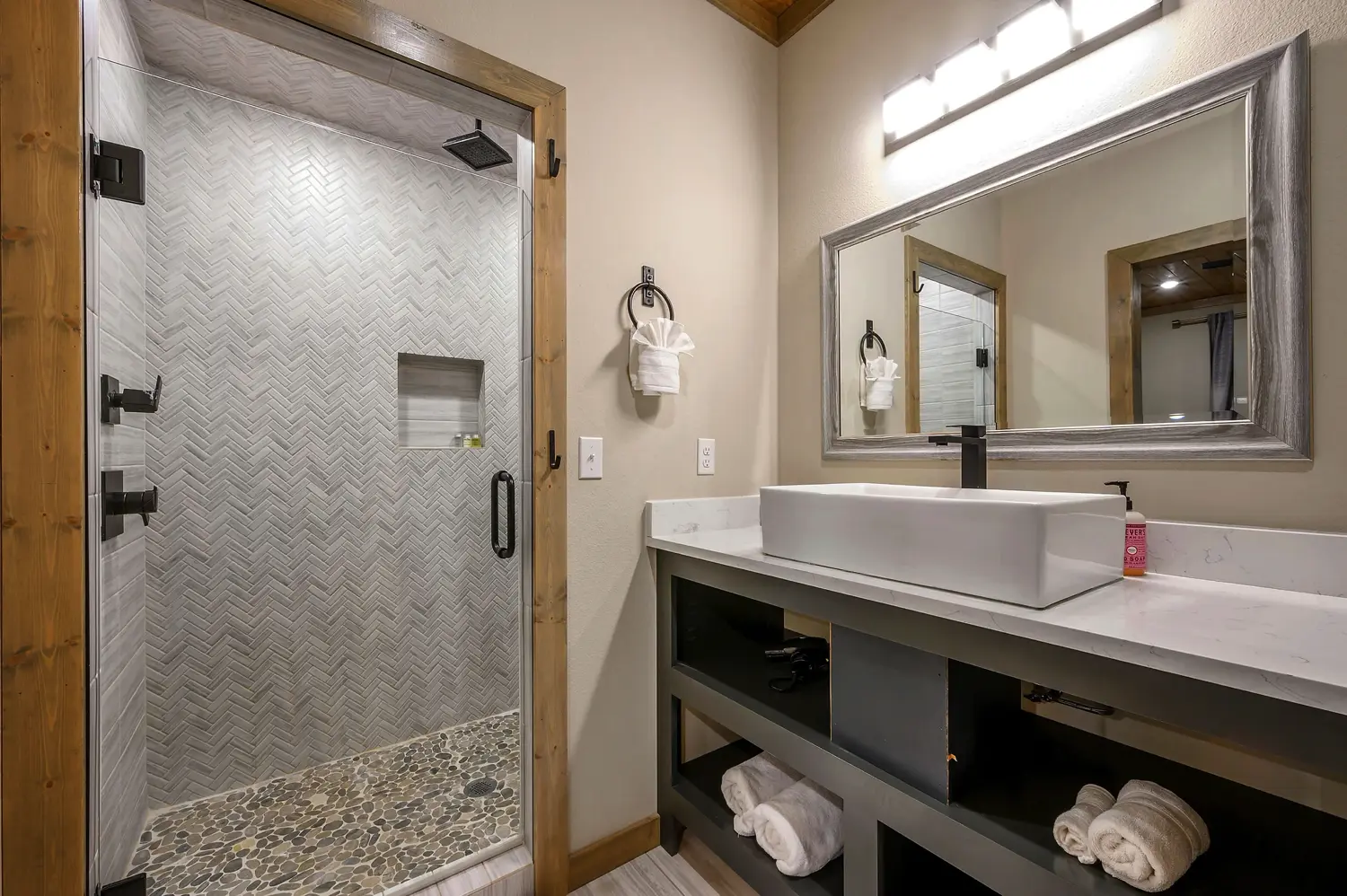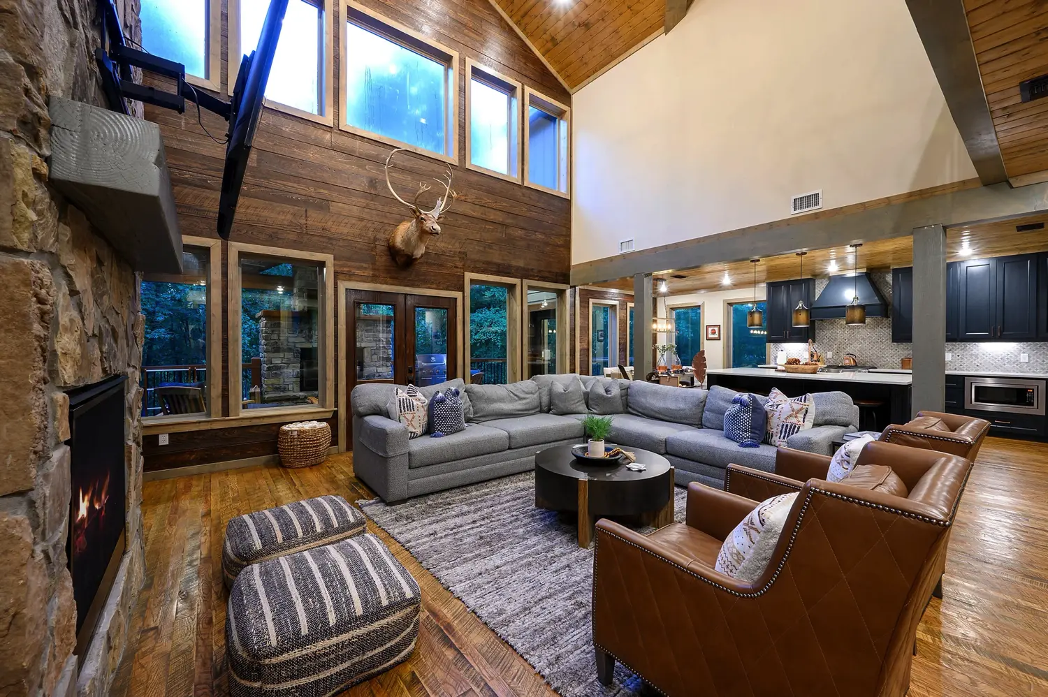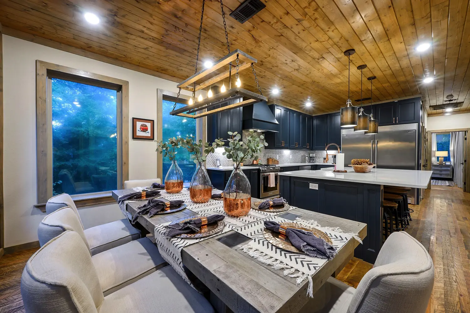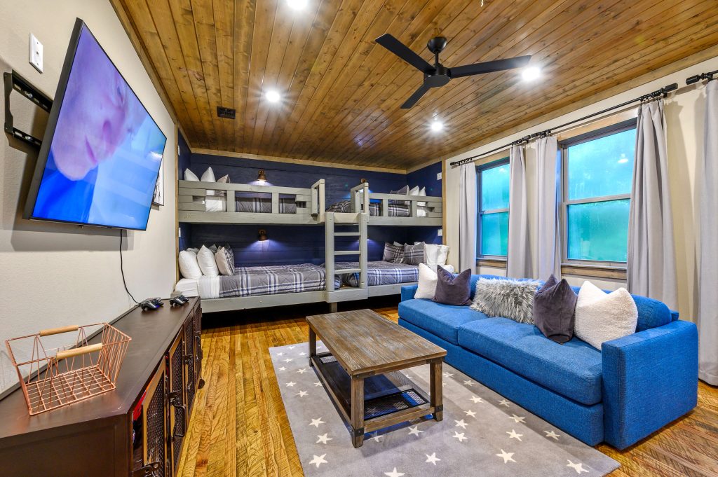 Copper Leaf Lodge is 2500 square feet and sits on over an acre of land, with view of the forest. Designer touches and craftsmanship combine to bring elements of exposed wood, stone, and unique tile combinations throughout the lodge. Floor to ceiling living room windows lend to stunning views of the 90’ pines that surround the property. Accommodating up to 12 guests, the lodge has three King Master Suites and large upstairs Bunkroom features 2 twin and 2 queen custom bunks. Our Chef’s kitchen and open floor plan to the living and dining room leads to the outdoor porch. Guests can stay on the deck and enjoy the oversized custom fireplace, and hot tub. Copper Leaf Lodge was built to host you and yours. Come make memories with us! COPPER LEAF LODGE IS NOT A PET FRIENDLY HOME, AND ALSO HAS A VERY STRICT NO SMOKING POLICY INSIDE THE HOME.