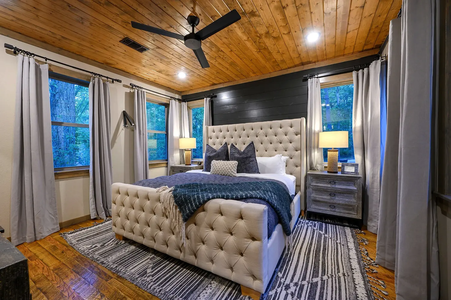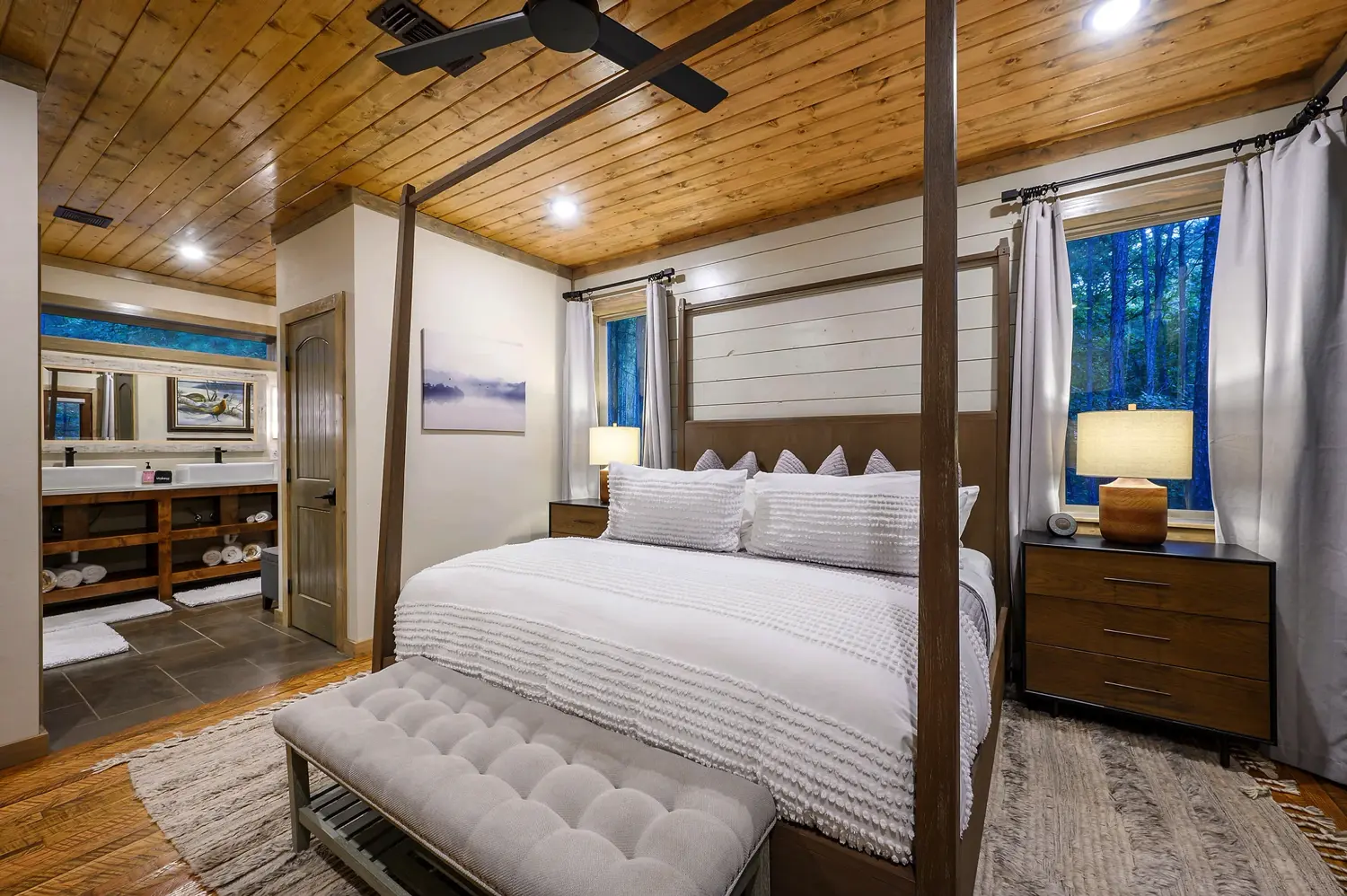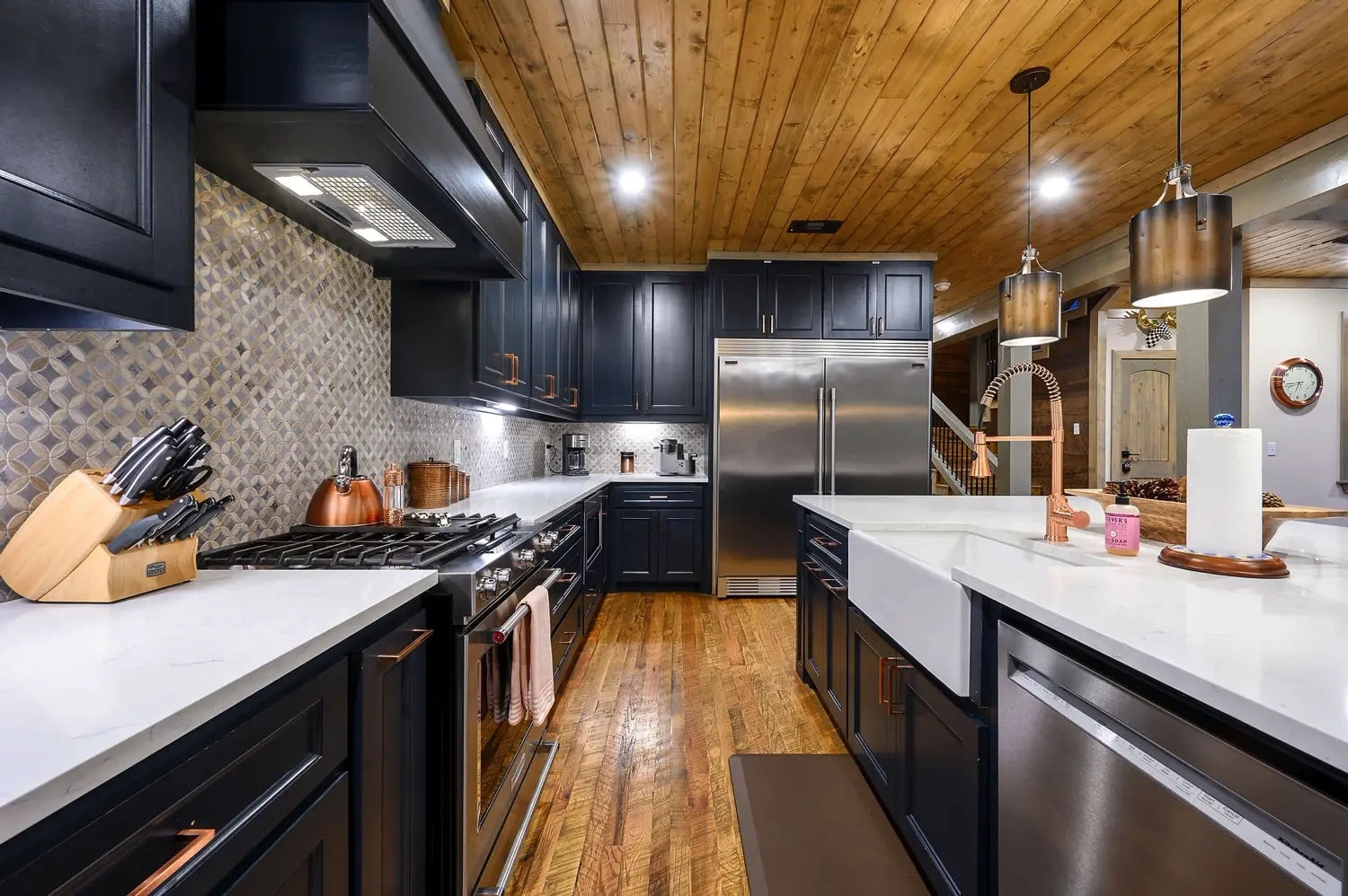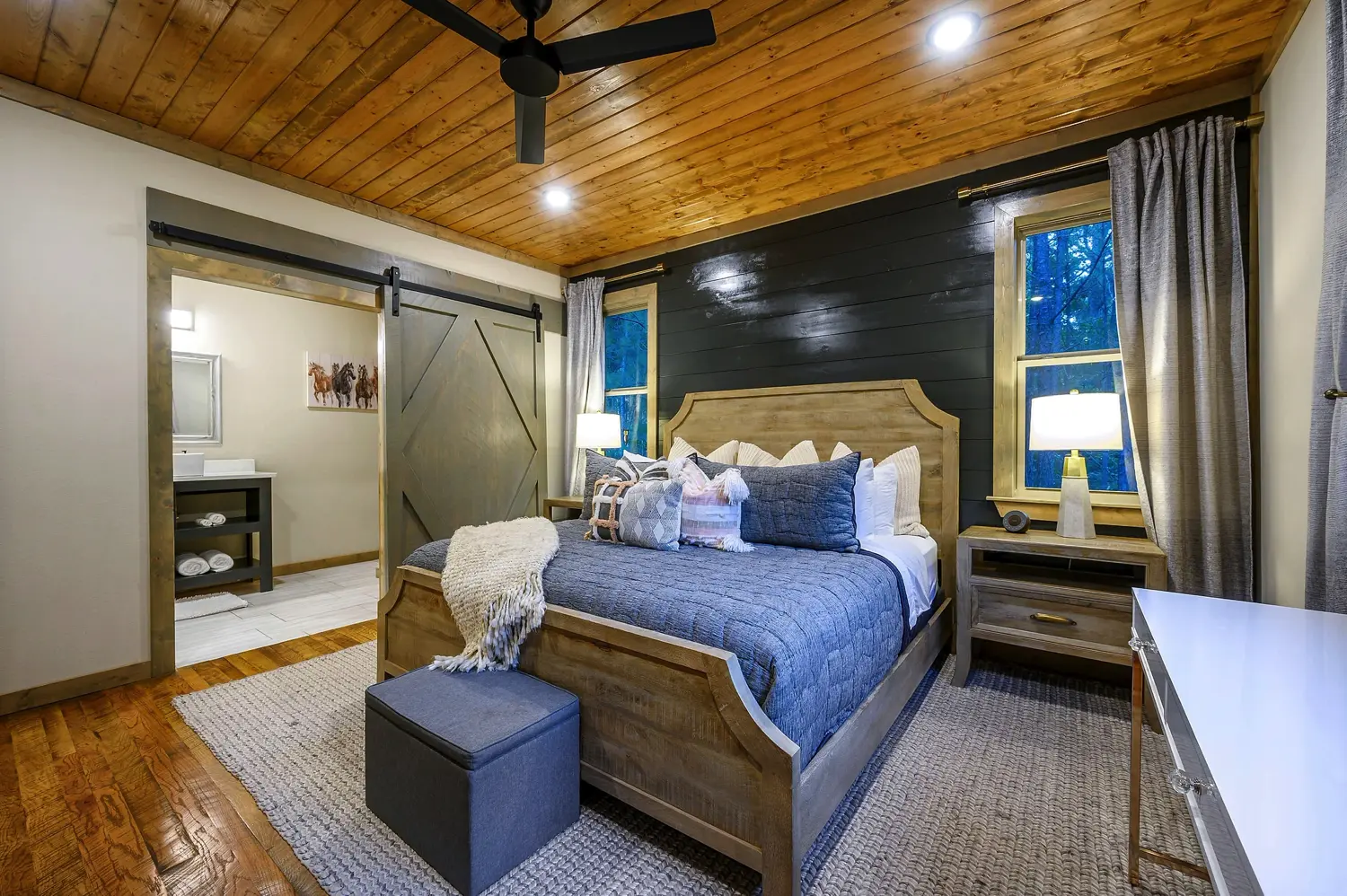 Copper Leaf Lodge is 2500 square feet and sits on over an acre of land, with view of the forest. Designer touches and craftsmanship combine to bring elements of exposed wood, stone, and unique tile combinations throughout the lodge. Floor to ceiling living room windows lend to stunning views of the 90’ pines that surround the property. Accommodating up to 12 guests, the lodge has three King Master Suites and large upstairs Bunkroom features 2 twin and 2 queen custom bunks. Our Chef’s kitchen and open floor plan to the living and dining room leads to the outdoor porch. Guests can stay on the deck and enjoy the oversized custom fireplace, and hot tub. Copper Leaf Lodge was built to host you and yours. Come make memories with us! COPPER LEAF LODGE IS NOT A PET FRIENDLY HOME, AND ALSO HAS A VERY STRICT NO SMOKING POLICY INSIDE THE HOME.