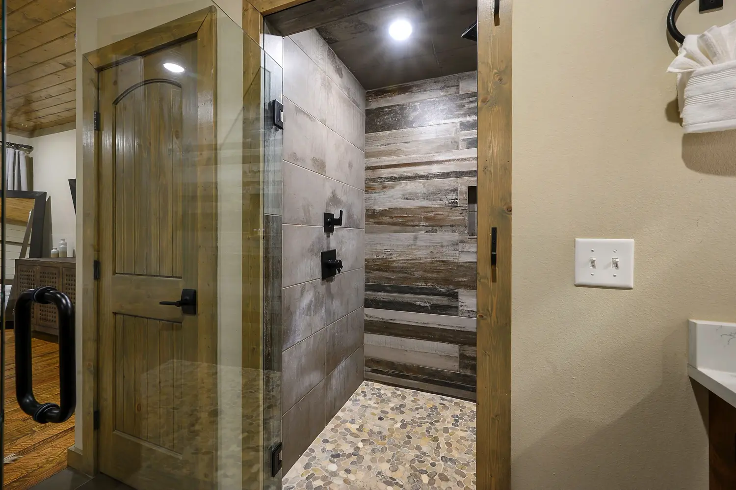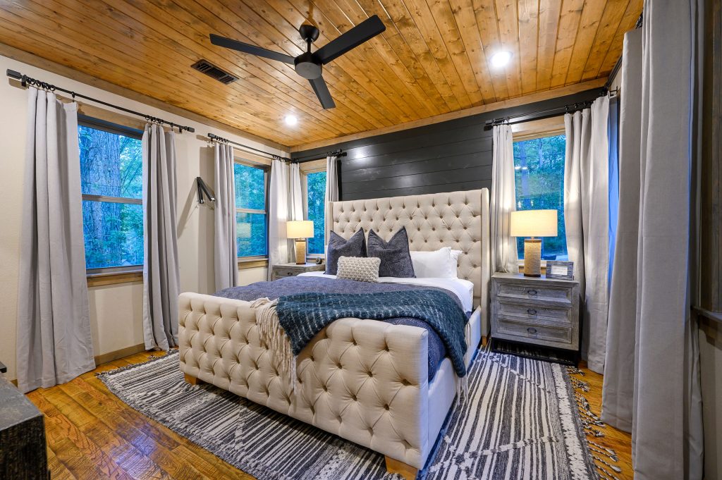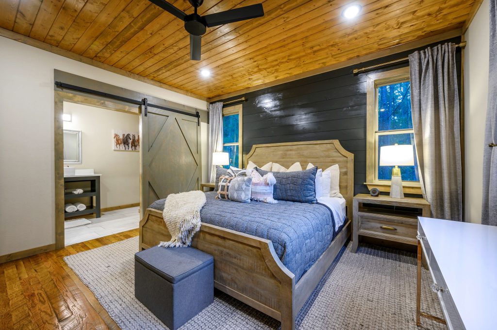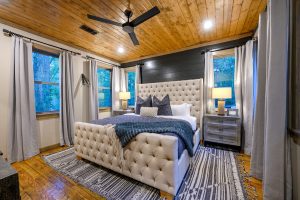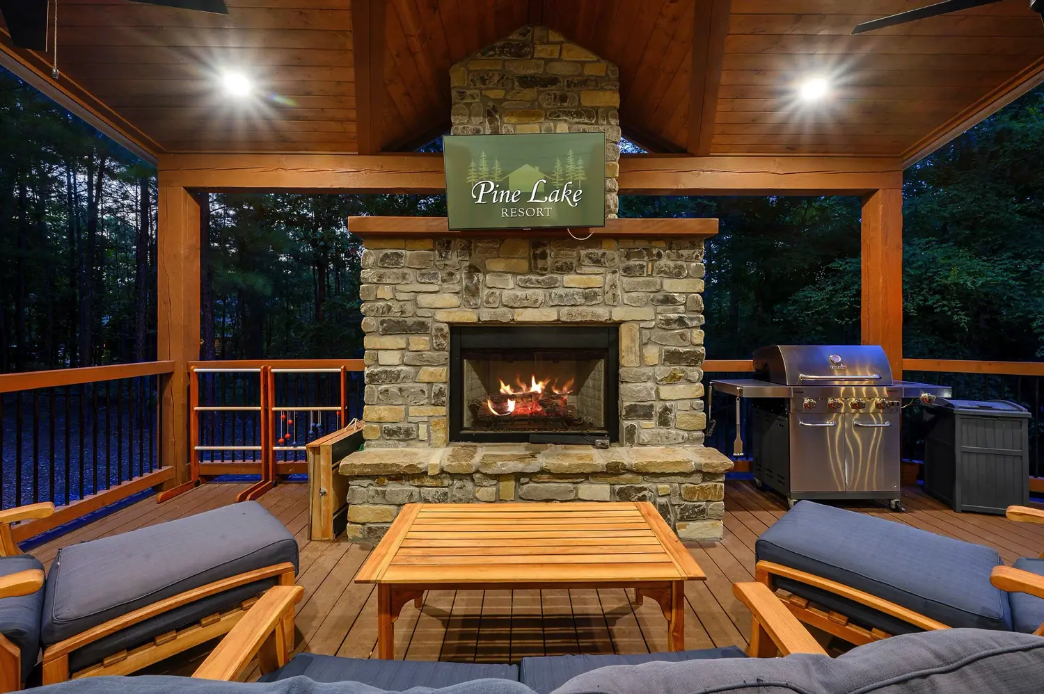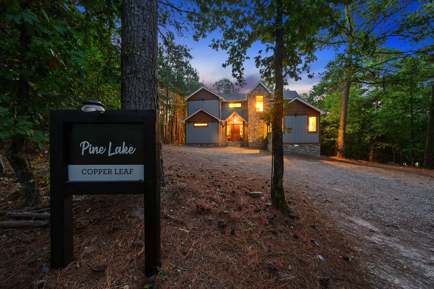 Copper Leaf Lodge is located at Pine Lake, which is just 5 minutes away from Beavers Bend State Park and only a short drive from all the great restaurants and attractions in Broken Bow and Hochatown. Our community has a picturesque, stocked lake for catch-and-release fishing, a community pool and playground, a spacious Clubhouse and grounds to congregate with other guests at Pine Lake, and a family-style Grill where you can dine-in or order right to your cabin! The Grill also serves alcohol. Â Our development was designed to allow each guest walking distance access to all of these great community amenities. Enjoy the quiet, tree-lined roads and walking trails, including bridges that pass over the lake, as you make your way toward the resort-style amenities that make Pine Lake the premier vacation destination in Broken Bow. Concierge services ranging from yard signs, photography, to grocery delivery can be arranged by calling us.