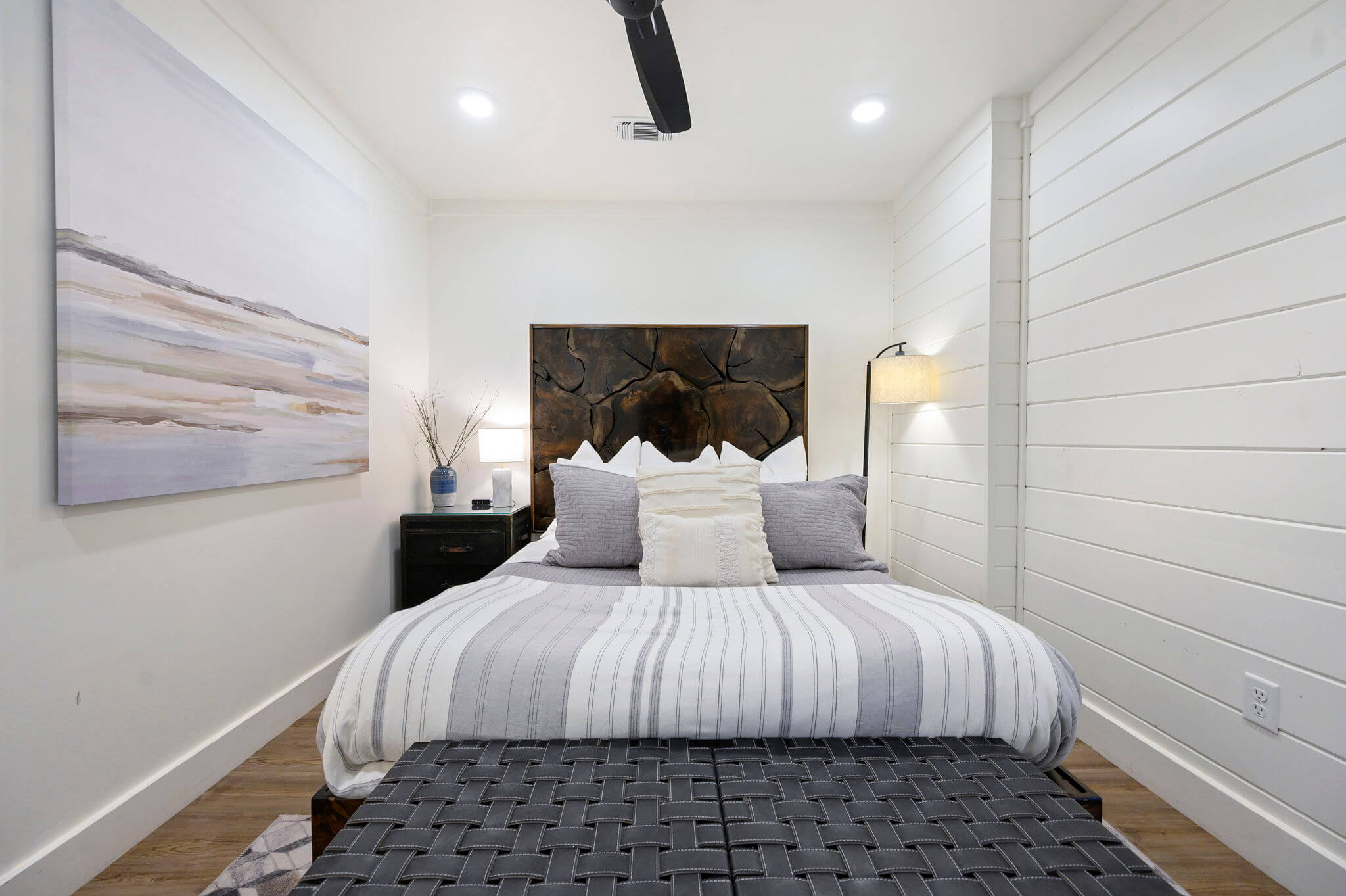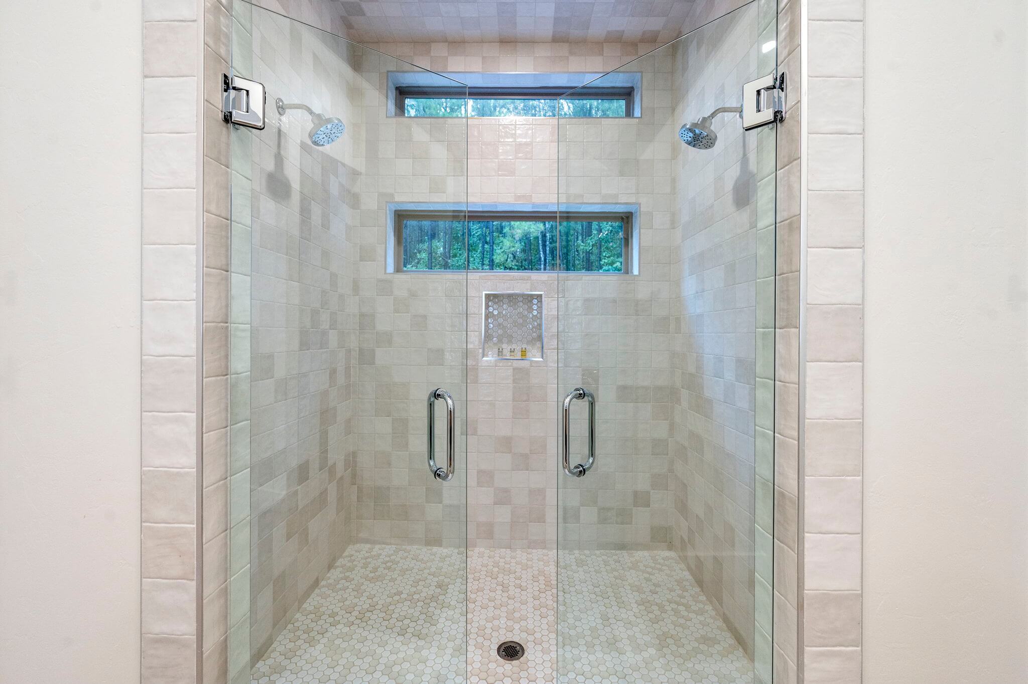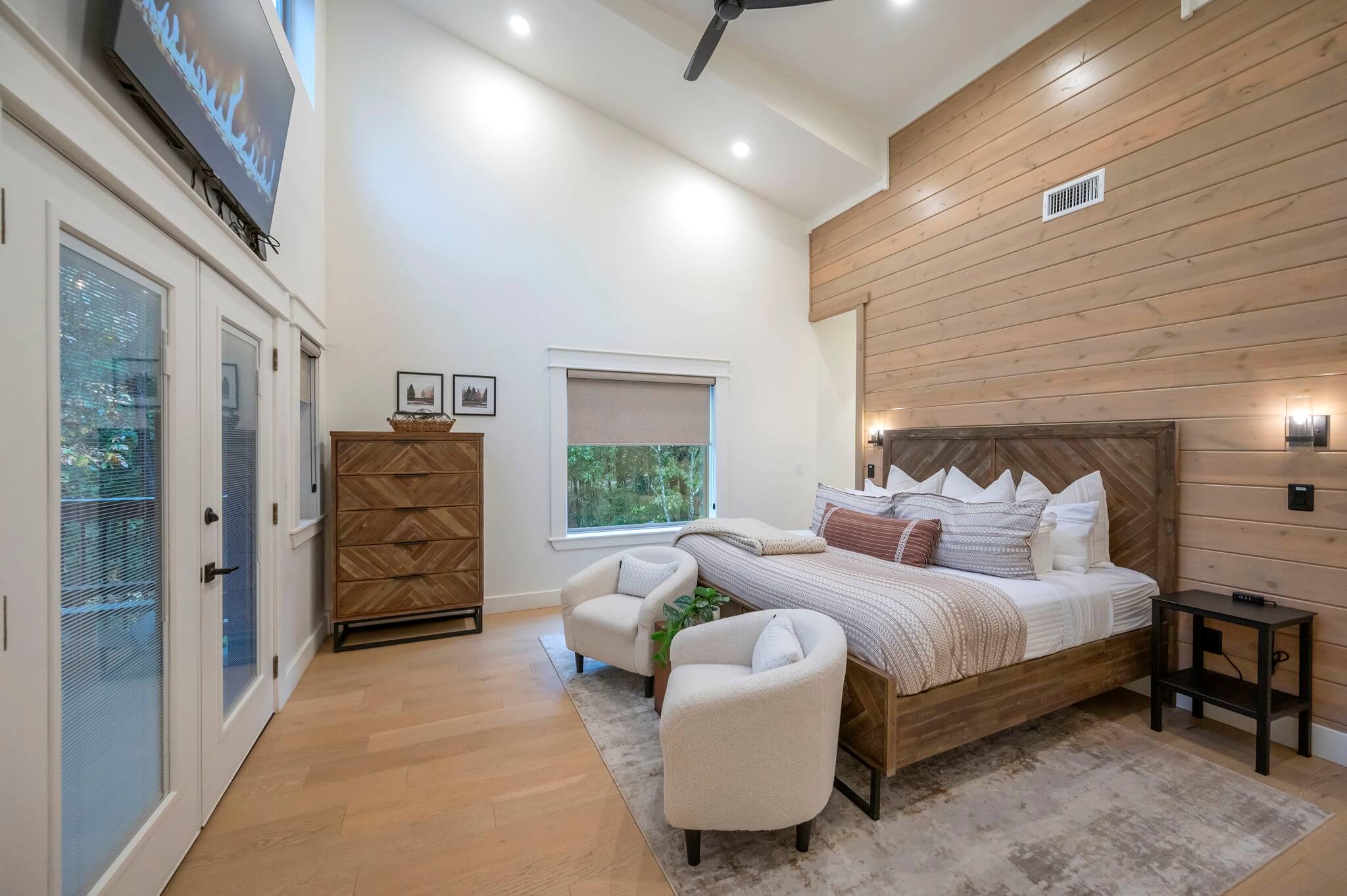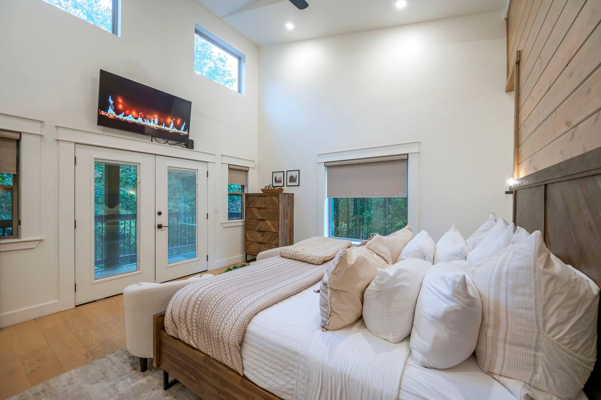 The main level features two king suites, each with HDTVs and en suite, spa-like baths, featuring dual sinks and large, dual-headed walk-in showers. Each king bedroom opens to a walk-out patio with rocking chairs to enjoy morning coffee.