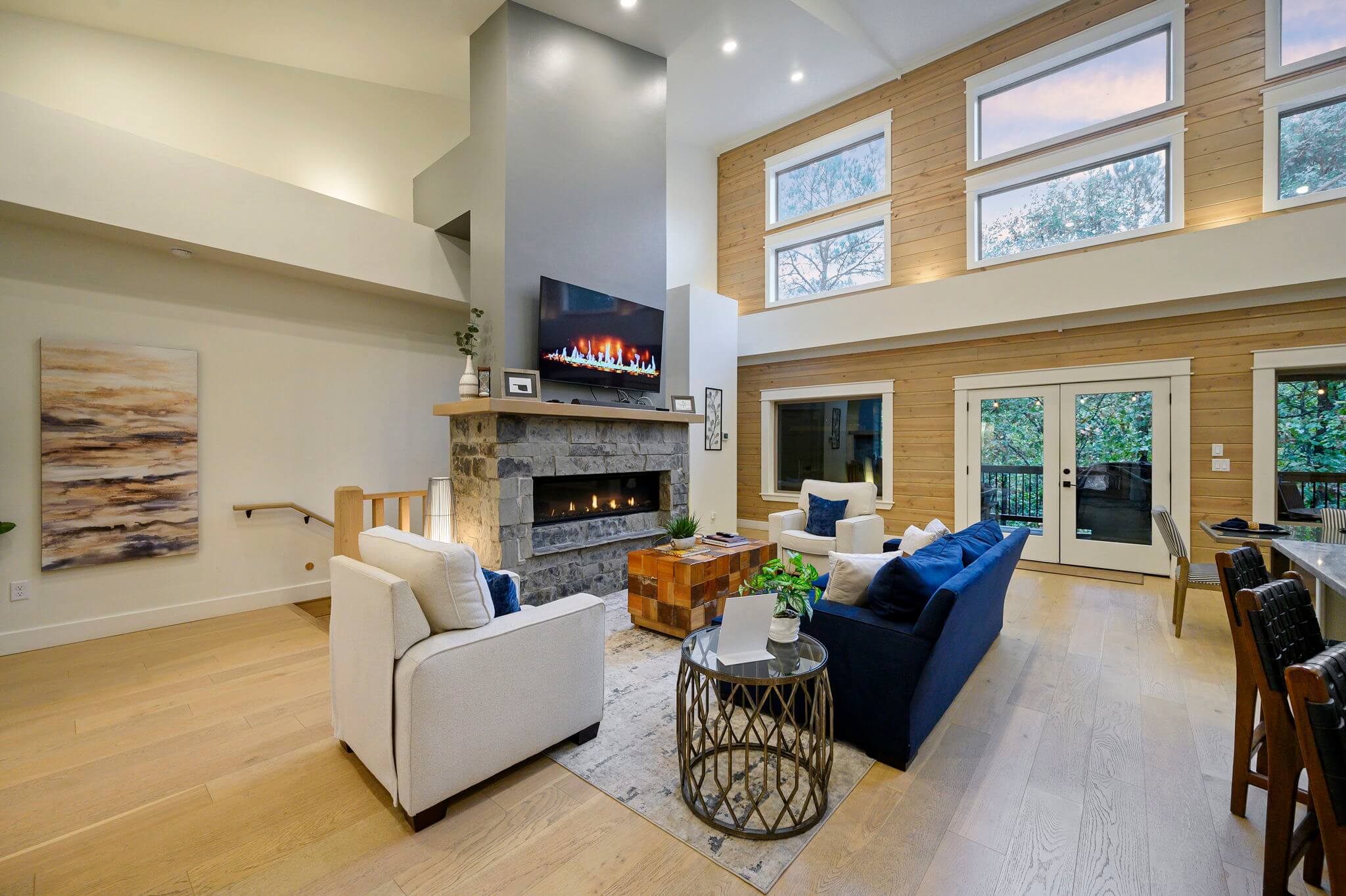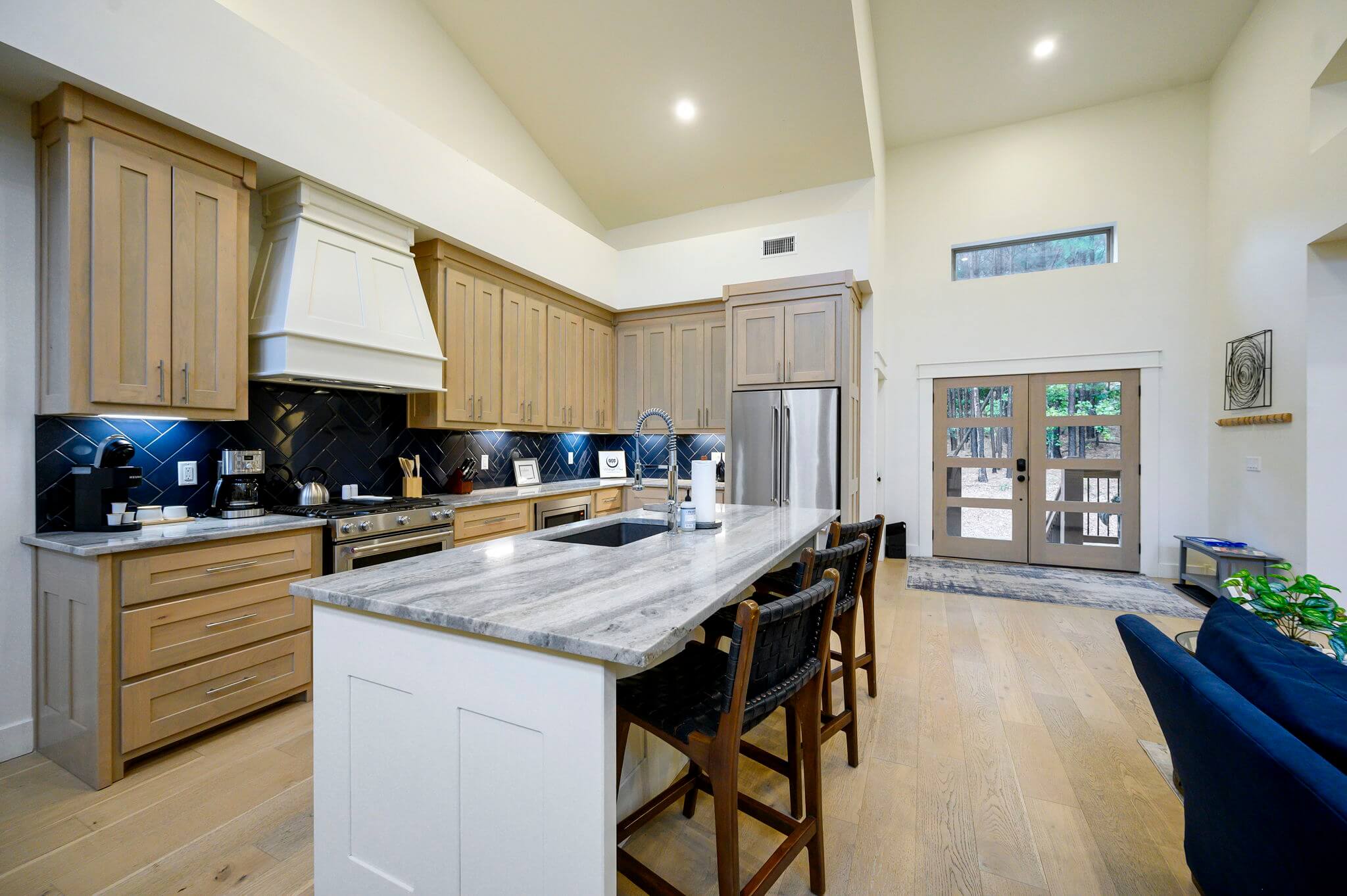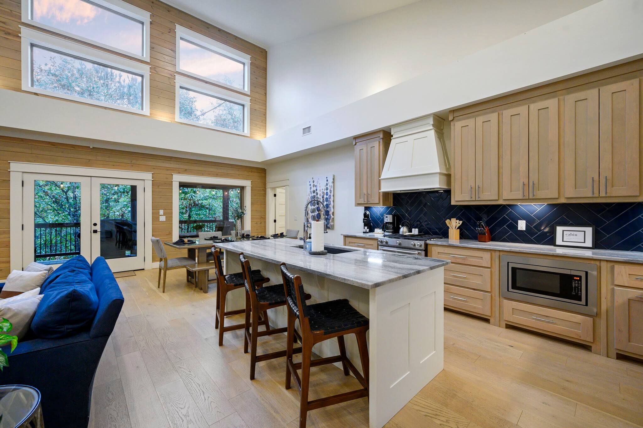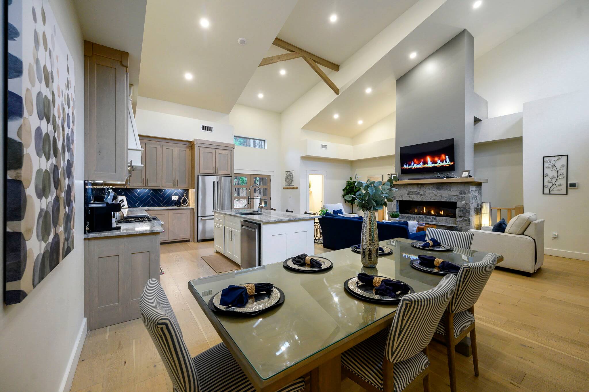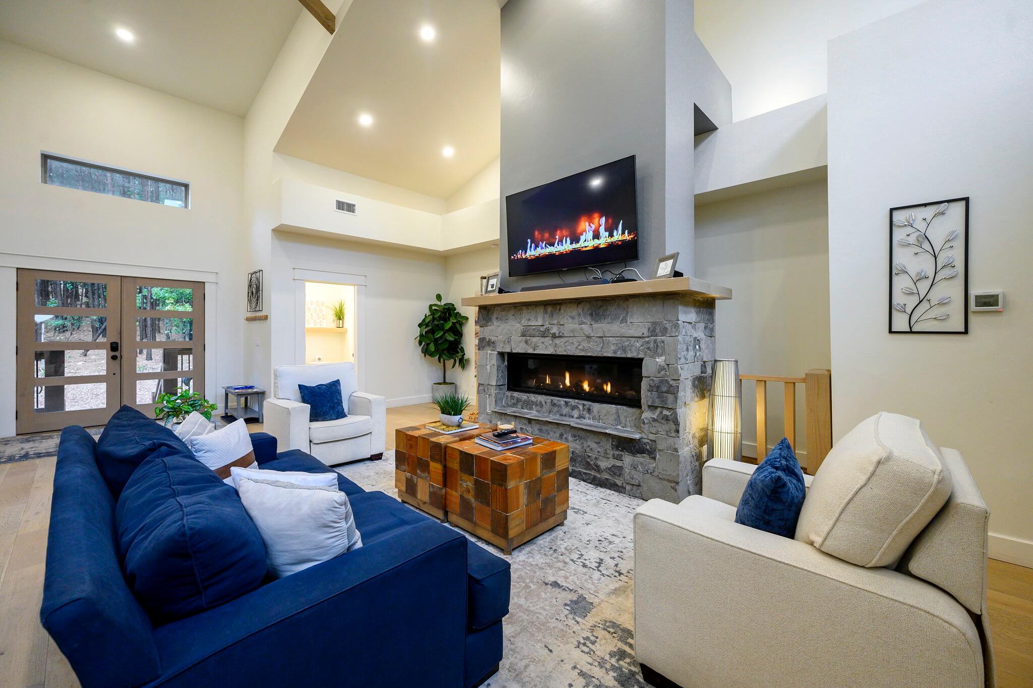 Spanning 3,128 sq feet of interior living space, the open concept living area and custom stoned fireplace connect to the fully equipped kitchen, with premium, stainless-steel appliances, a drop coffee maker, a single cup Keurig machine and a full array of cooking tools. The custom dining table comfortably seats six adults, while the adjacent kitchen island seats three. The lower level includes another living area for activities, like playing the vintage arcade game or cozying up for movie night.